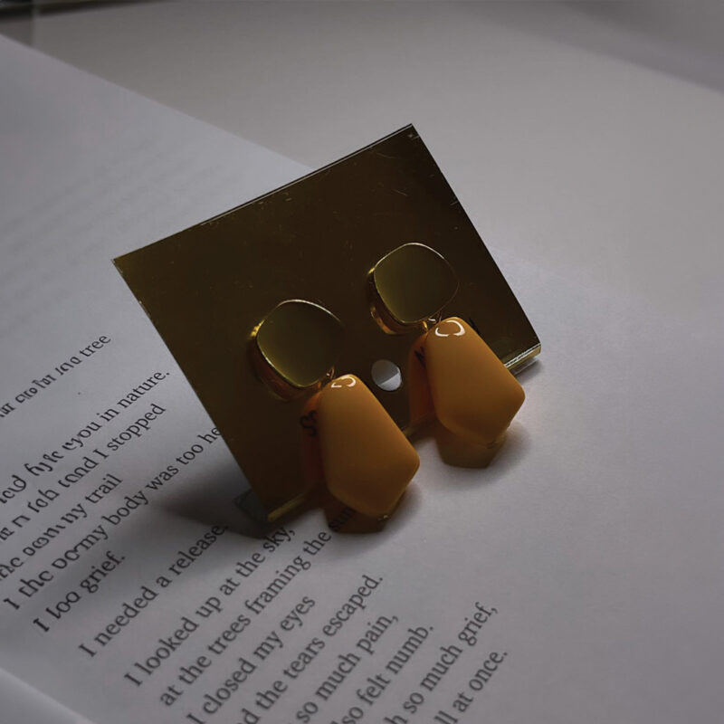 These earrings present a bold mustard yellow color on a smooth, geometric drop design, anchored by a golden circular stud.